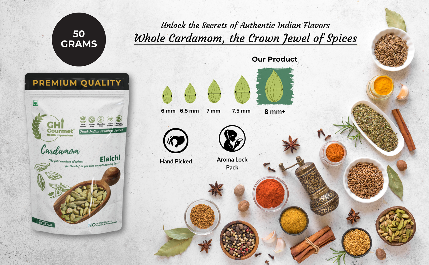 Discover the exquisite flavor of our Premium Quality Whole Cardamom, carefully packed in a 50g pack.